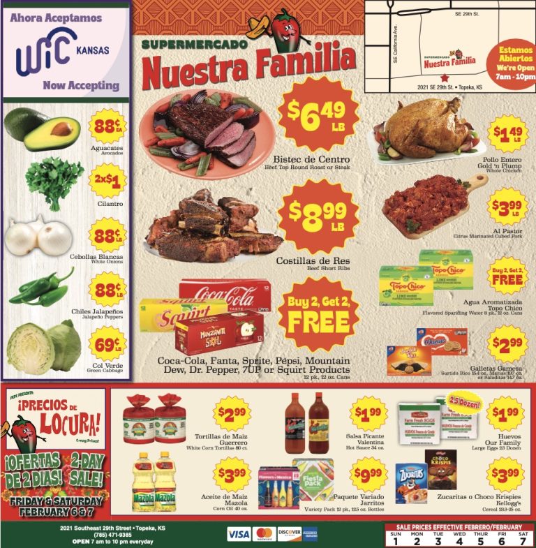 Supermercado Nuestra Familia está ubicado en 2021 SE 29th St. en Topeka y está abierto todos los días de 7 a.m. a 10 p.m., brindando conveniencia y ahorro a las familias del área.
